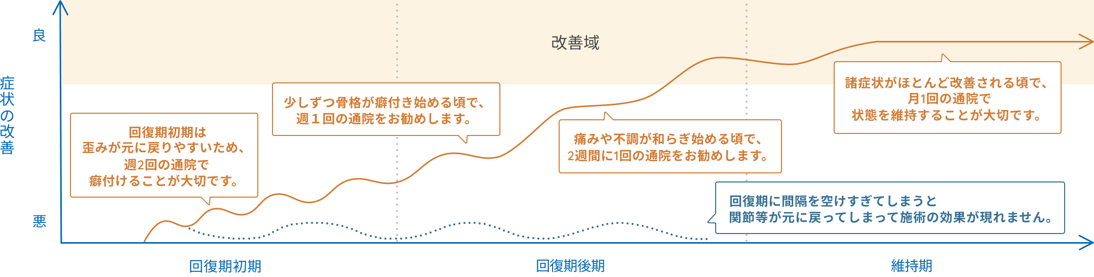 根本的な体質改善を目指す整体施術では、骨盤や骨格筋の正しい位置を身体に定着させるため、一定期間の継続的な通院が必要となります。