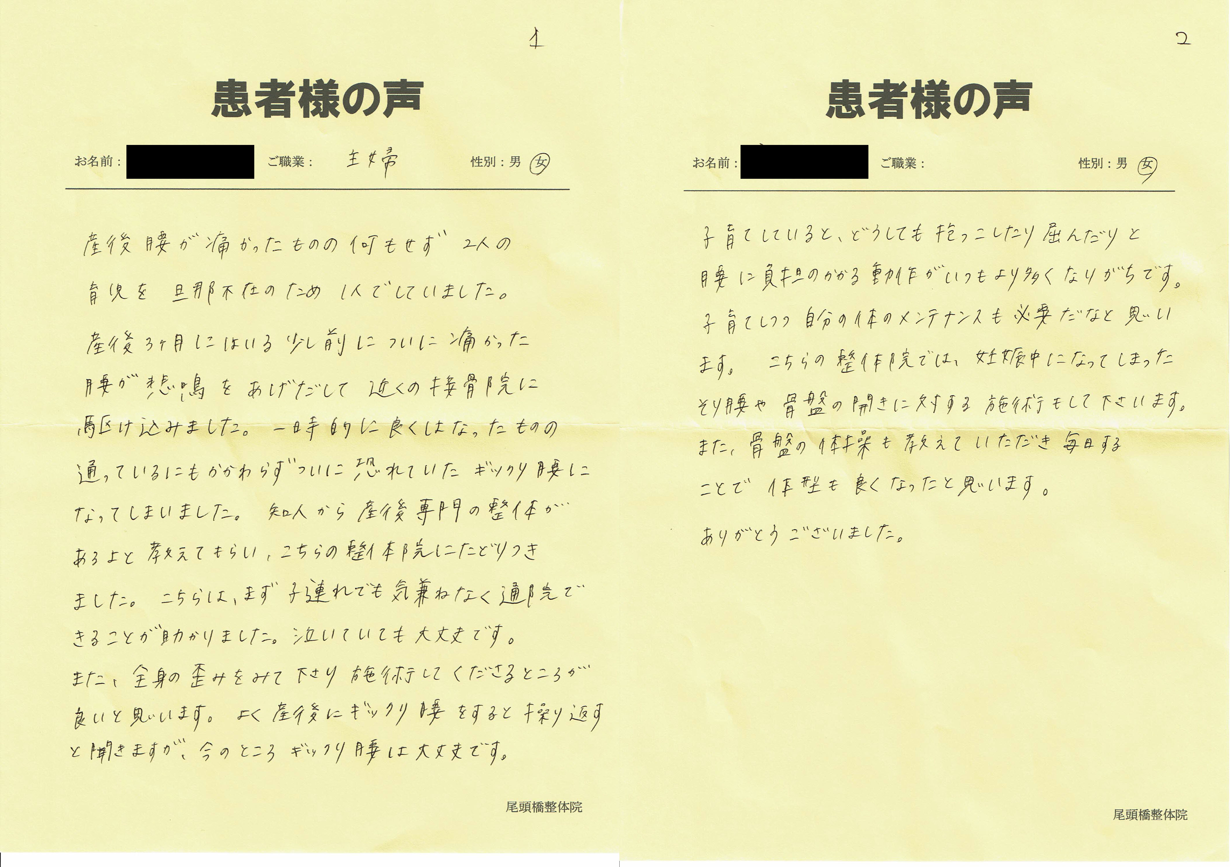 子育てしていると、どうしても抱っこしたり屈んだりと腰に負担のかかる動作がいつもより多くなりがちです。子育てしつつ自分の体のメンテナンスも必要だなと思います。こちらの整体院では、妊娠中になってしまったそり腰や骨盤の開きに対する施術をして下さいます。また、骨盤の体操も良くなったと思います。ありがとうございました。