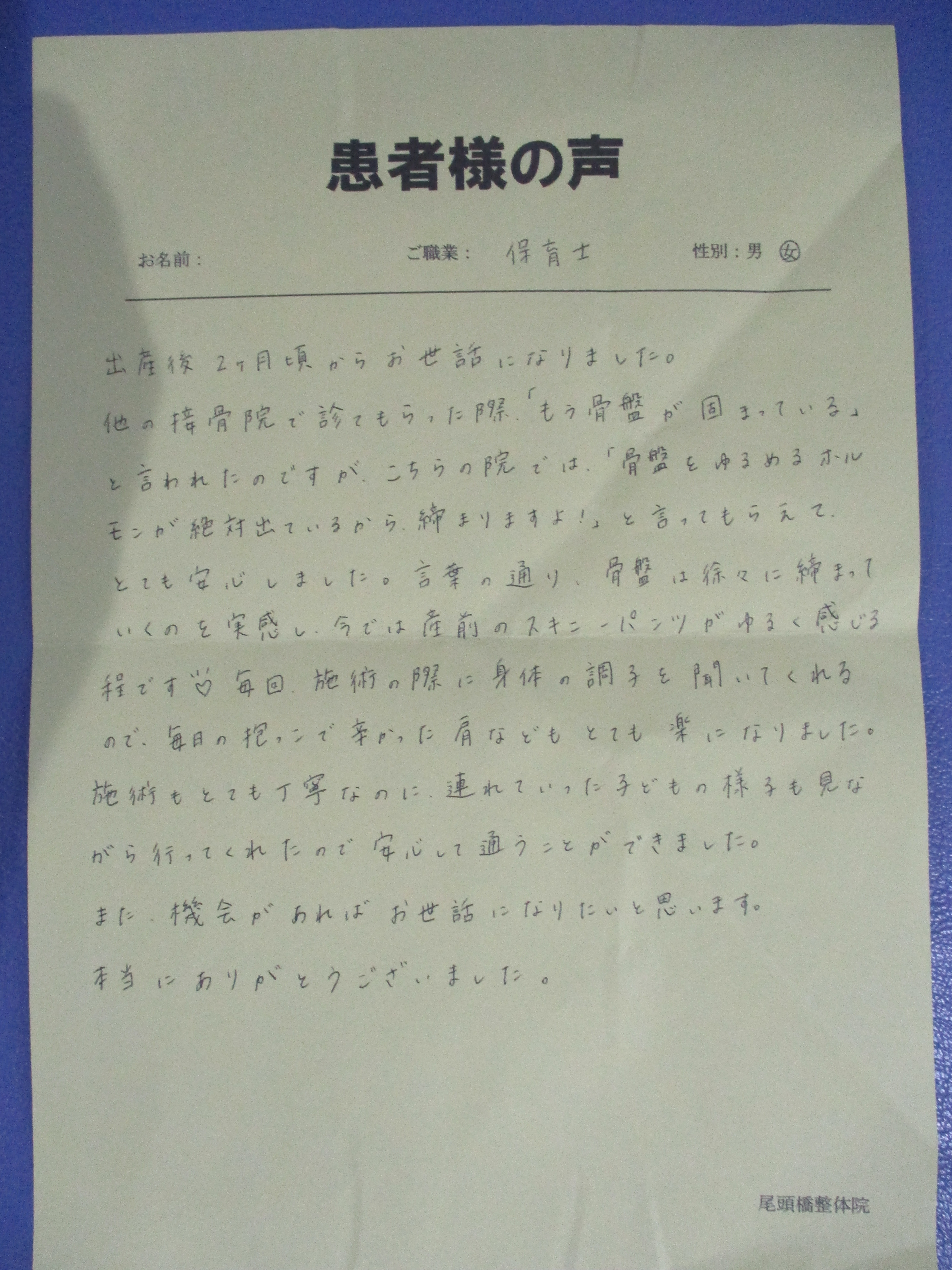出産後2ヶ月頃からお世話になりました。他の接骨院で診てもらった際、「もう骨盤が固まっている」と言われたのですが、こちらの院では、「骨盤をゆるめるホルモンが絶対出ているから、締まりますよ!」と言ってもらえて、とても安心しました。言葉の通り、骨盤は徐々に締まっていくのを実感し、今では産前のスキーニーパンツがゆるく感じる程です。毎回、施術の際に身体の調子を聞いてくれるので、毎日の抱っこで辛かった肩などもとても楽になりました。施術もとても丁寧なのに、連れていった子どもの様子も見ながら行ってくれたので安心して通うことができました。また、機会があればお世話になりたいと思います。本当にありがとうございました。